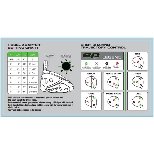 Our most advanced driver EVER! The epTOUR Driver head* uses variable thickness cup face technology for the fastest allowable USGA/R&A ball speeds across the entire face. By utilizing an ultra-strength carbon fiber crown, we have produced our most forward and lowest driver center-of-gravity to date, ensuring the low launch, low spin, and boring trajectory characteristics that elite players demand. The adjustable hosel and head weighting system ensures you are always dialed in for your unique swing, course setup conditions, or trajectory demands.