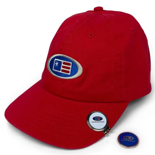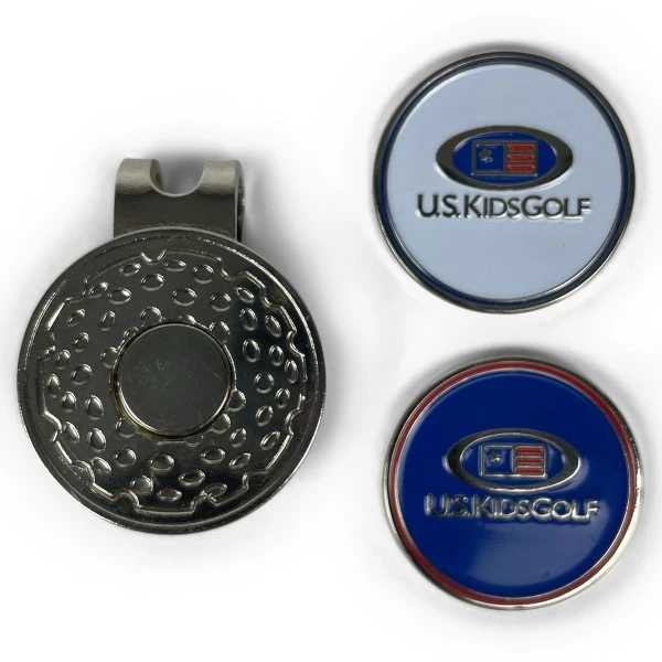 Magnetic hat clip attaches to hat or visor. It includes two interchangeable iron stamped ball markers embellished with the U.S. Kids Golf logo on one side and alignment lines on the other side.