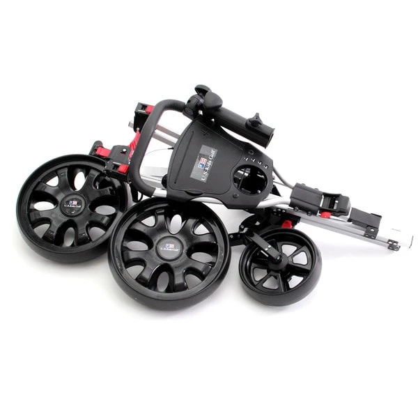 Lightweight 3 wheel push cart. Adjustable top bracket to fit golf bags 21.5″ (UL42) and above. The dual strap secures the golf bag to the cart.